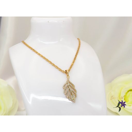 Levélakakú medál csupa csillogó apró cirkóniakővel.Csiga mintázatú kissé metszett nyaklánc jár hozzá. Gyönyörű darab Szin: 18K Méret: 50 cm /3mm Medál: 40x25 mm