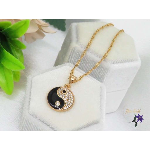 Gold Filled Jing Jang medálos nyakláncEgyik fele fekete tűzzománc másik gazdagon díszített cirkon kövekkelSzin: 18KMéret: 55 cmMedál 20x15mm