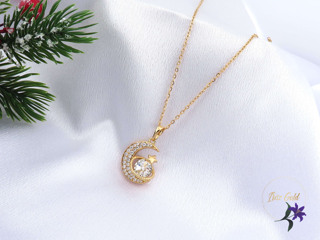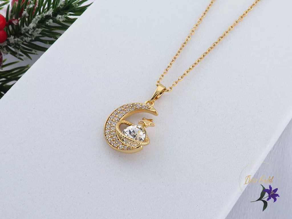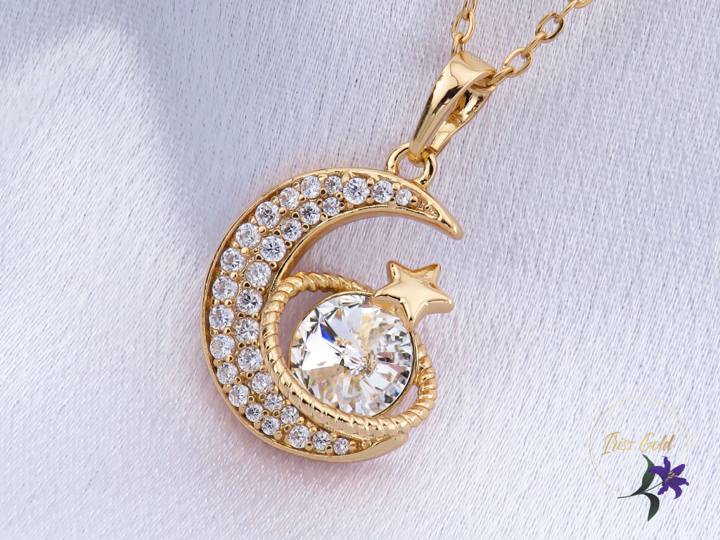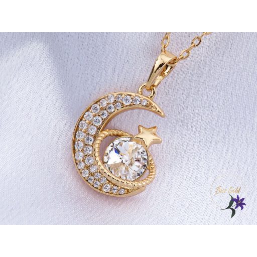 Antiallergén meseszép hold saturnus medálos nyaklánc Medál apró kikristálynkövekkel kirakott hold sarló benne egy fehér csillogó kristály egy csillagocskával Szin: 18K Méret: 40+5cm Medál: 20x25mm