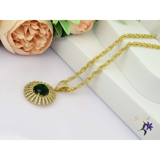 Antiallergén bőrbarát medálos nyaklánc Lazán csavart nyakláncon virág alakú medál nagy zöld kővel sok pici cirkóniakővel díszítve Nagyon mutatós egyedi darab Szin: 14K Lánc : 55 cm/4mm Medál: 4x3 cm Kő: 12x12mm