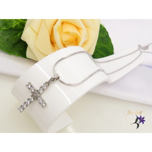 Antiallergén kereszt medálos nyaklánc.Medál gazdagon díszített cirkóna kövekkel, lánc szép fényes henger alakúSzin: rodium(ezüst)Méret:47cm/1,5mmMedál:30x18mm