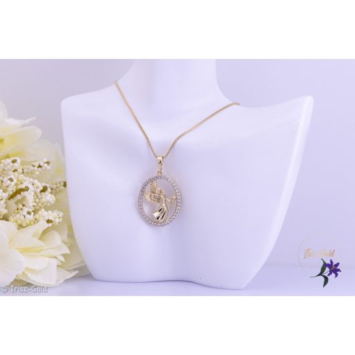 Az angyal medált díszítő kövek gondosan csiszolt cirkónium kövek, amelyek foglalatban helyezkednek el. A precíz csiszolásnak köszönhetően szépen verik vissza a fényt, így a nyaklánc finoman csillan meg mozgás közben. A foglalatos megoldás stabil tartást ad a köveknek, ezáltal a díszítés tartós és harmonikus marad.