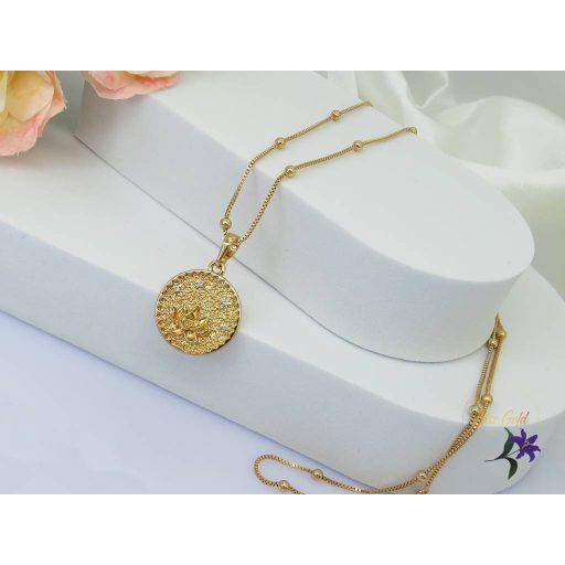 Antiallergén lótusz virágos nyaklánc .Kis kerek medálban lótusz virág pici fehér cirkóna kövekkel díszítve, lánc arany gyöngyös .Szin: 18K Méret: 50cmMedál: 24x18mm