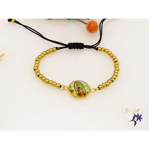 Goldfilled apró aranyszínű gyöngyös karkötő fekete selyem zsinóron Szűz Máriát ábrázoló köztessel