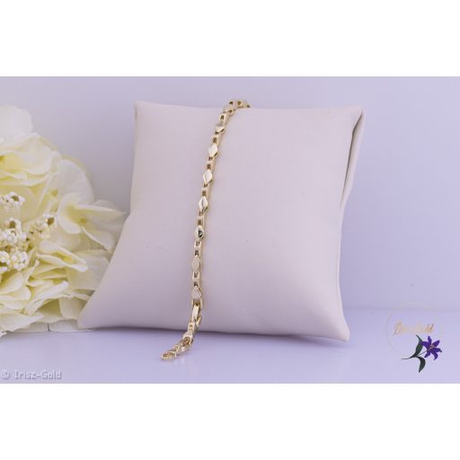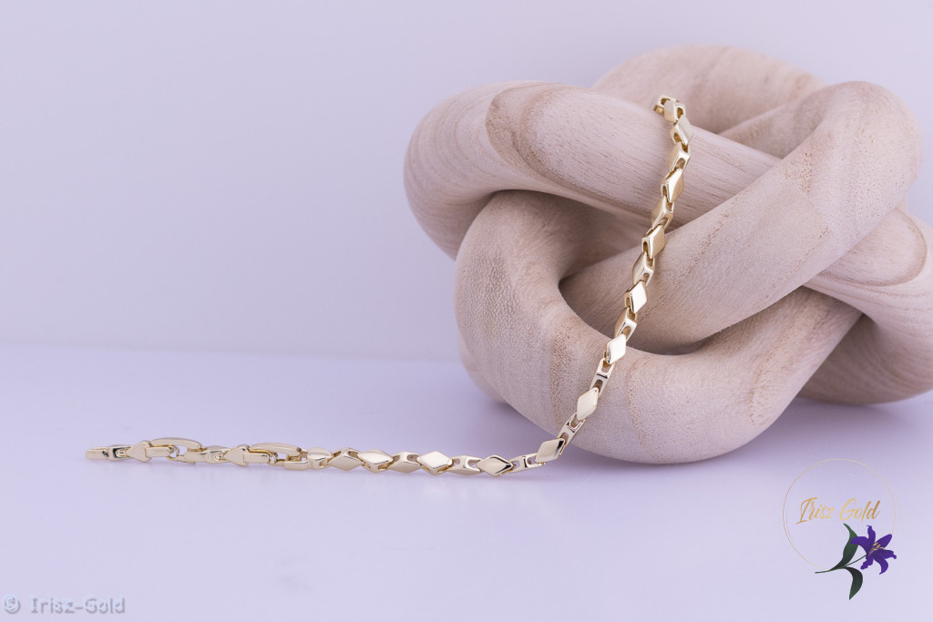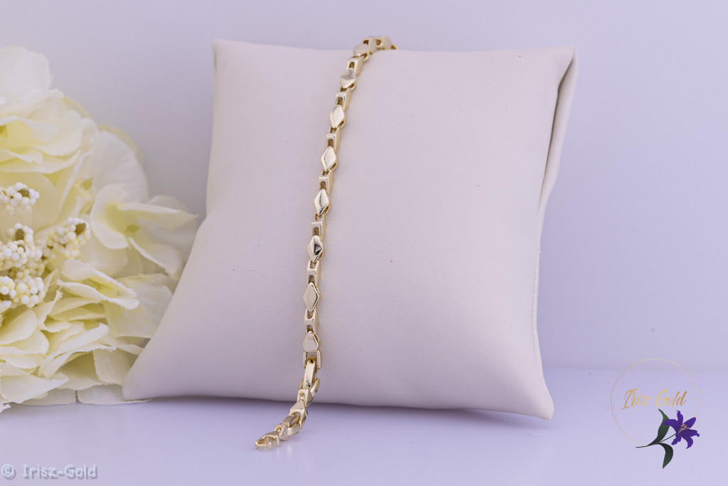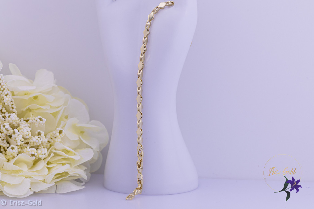 A karkötő rombusz szemes kialakítása finom, geometrikus mintázatot ad, amely letisztult, mégis látványos megjelenést kölcsönöz. A szemet gyönyörködtető forma jól illeszkedik a klasszikus és a modernebb stílusú öltözékekhez is, ezért könnyen beilleszthető a mindennapi és alkalmi kiegészítők közé. A 14K hatású aranyszín meleg tónusa elegánsan emeli ki a csuklót, anélkül hogy túlzó lenne.