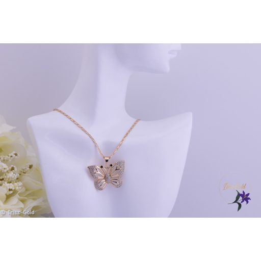 A gondosan megmunkált pillangó medál finom, nőies részleteivel emeli ki a dekoltázst, miközben a nyaklánc könnyű súlya kényelmes viselést biztosít egész nap. A cirkónium kövek precízen csiszoltak és foglalatban helyezkednek el, ami esztétikus, rendezett megjelenést és tartós rögzítést eredményez. A kövek csillogása elegánsan tükrözi a fényt, így a nyaklánc diszkréten, mégis látványosan díszíti az öltözéket.
