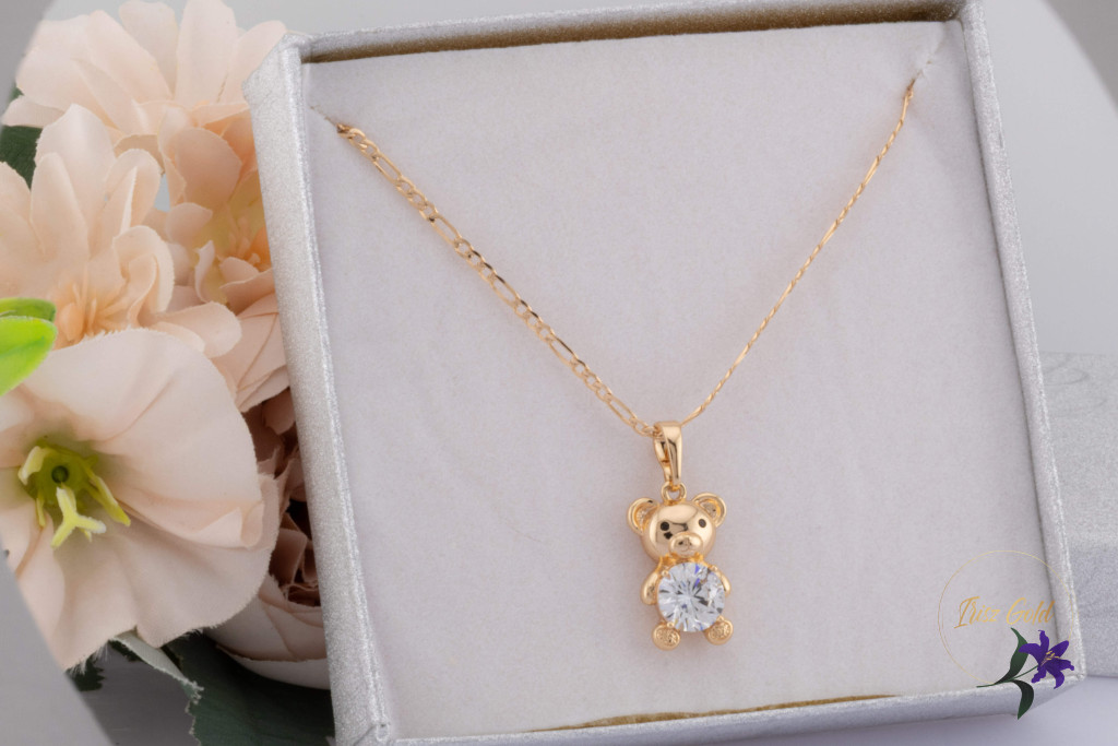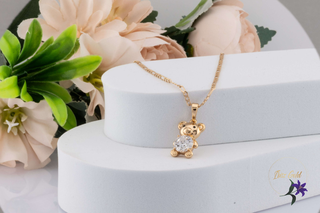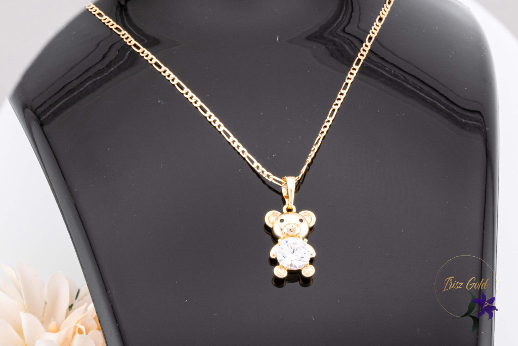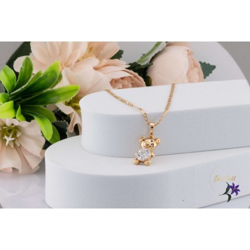 Natali antiallergén bájos maci medálos nyaklánc fehér kővel – 18K
