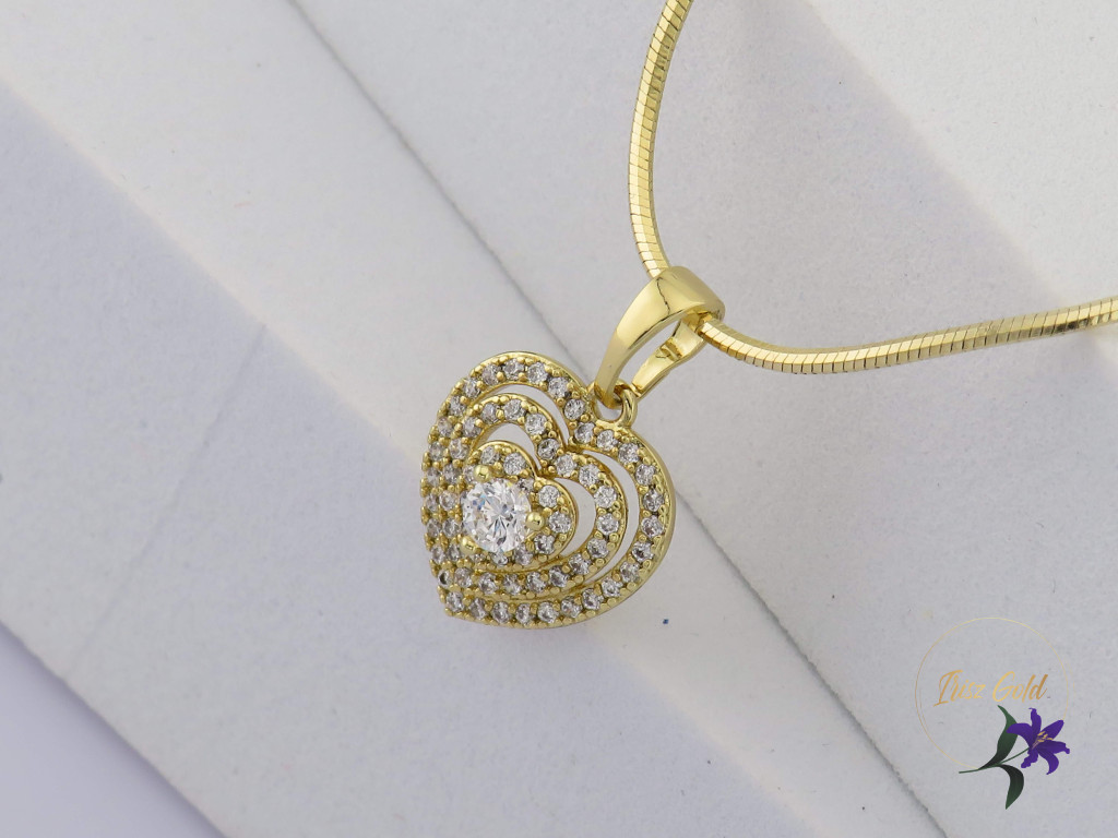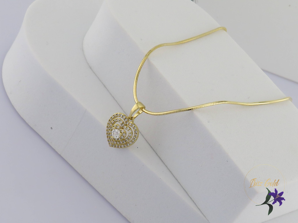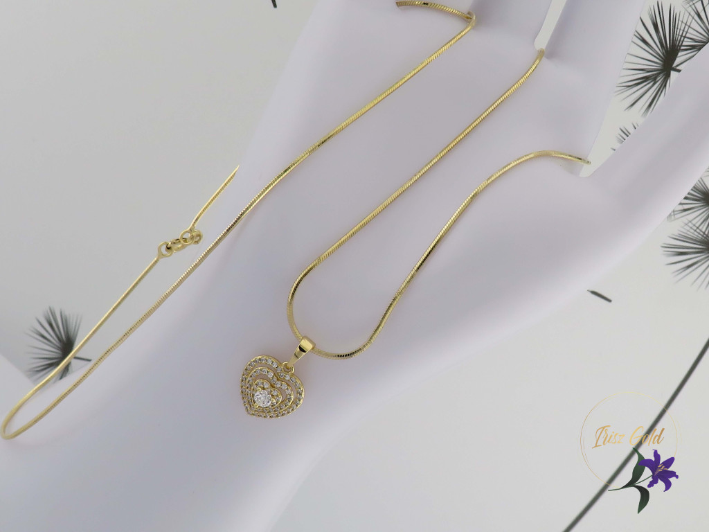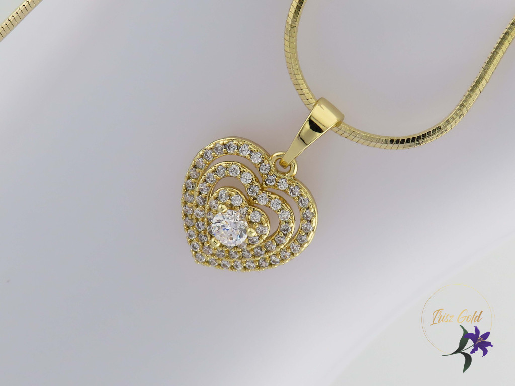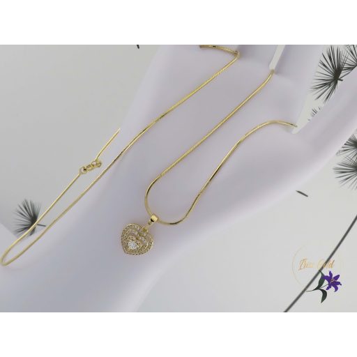 A nyaklánc 14K hatású arany színű bevonattal készül, mely meleg, elegáns árnyalatot ad az ékszernek. A szíves medálban elhelyezett, gondosan csiszolt cirkónium kövek ragyogása a gyémántra emlékeztet, így visszafogottan, mégis látványosan csillannak meg a fényben. A kövek biztonságos foglalatban kaptak helyet, ami stabil tartást és kifinomult megjelenést biztosít.