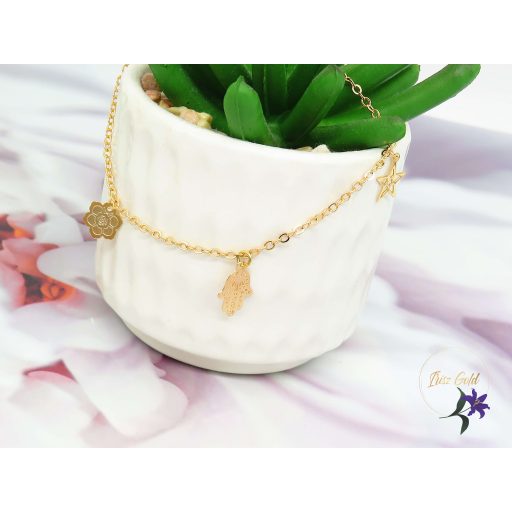 Gold Filled vékony karlánc farima keze ,csillag és lótusz virág csüngőkkel