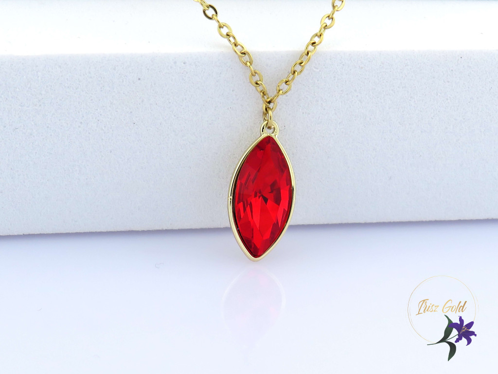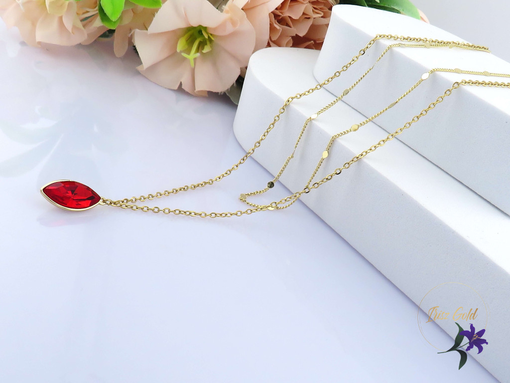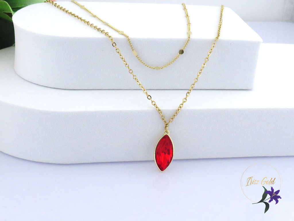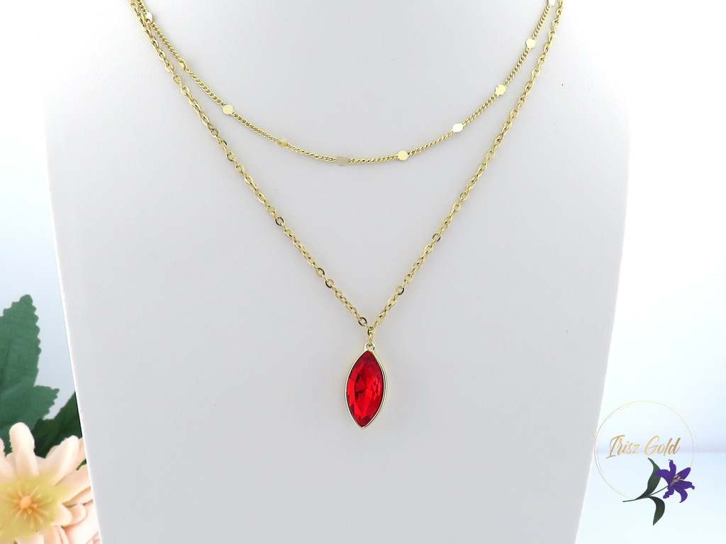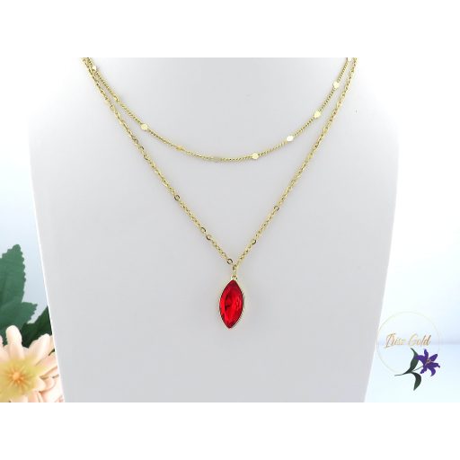 Goldfilled egyedi duplasoros nyaklánc ék köve egy tűzpiros kristályköves medál Egyik nyaklánc apró kis lapos szemek díszítik Szin: 14K Méret: lánc belső lánc hosszabbítóval mérve 43 cm de 38 cm nyakra is jó Medál : 18x 10 mm