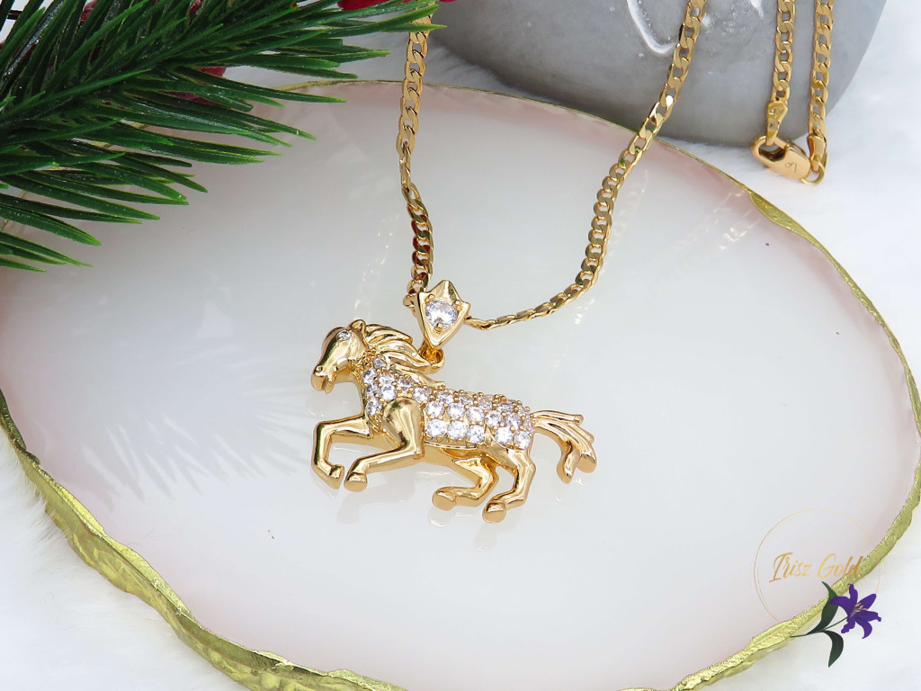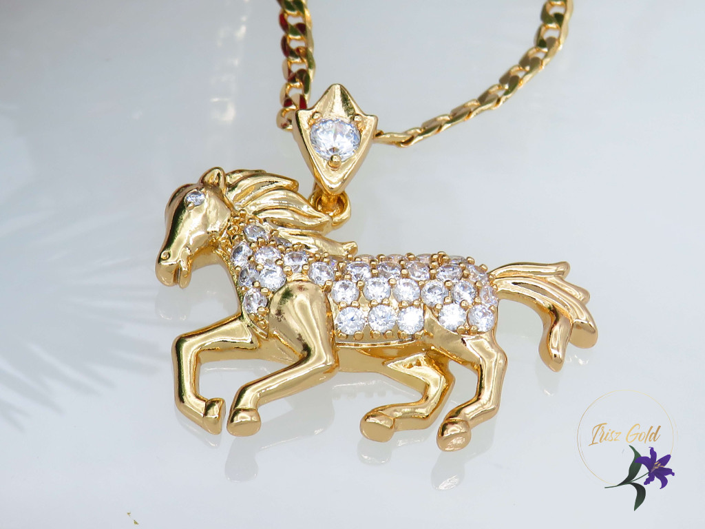 Gold Filled ló medálos nyaklánc Vágtató ló cirkóna kövekkel díszítve Szin. 18K Méret: Lánc 50 cm Medál: 25x20mm