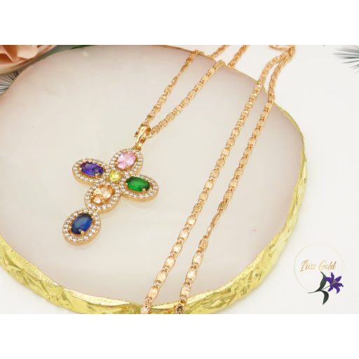 Antiallergén szinesköves kereszt medálos nyaklánc.Kereszten öt darab színes cirkóna kő helyezkedik el apró köves foglalatbanSzin: 18K Méret: lánc 59 cm / 2,5mm metszett csillagmintás Medál: 40x20x7mm