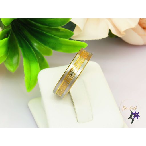 Nemesacél karikagyűrű .Középen görög motívum díszíti ,szélén rodium(ezüst) csík
